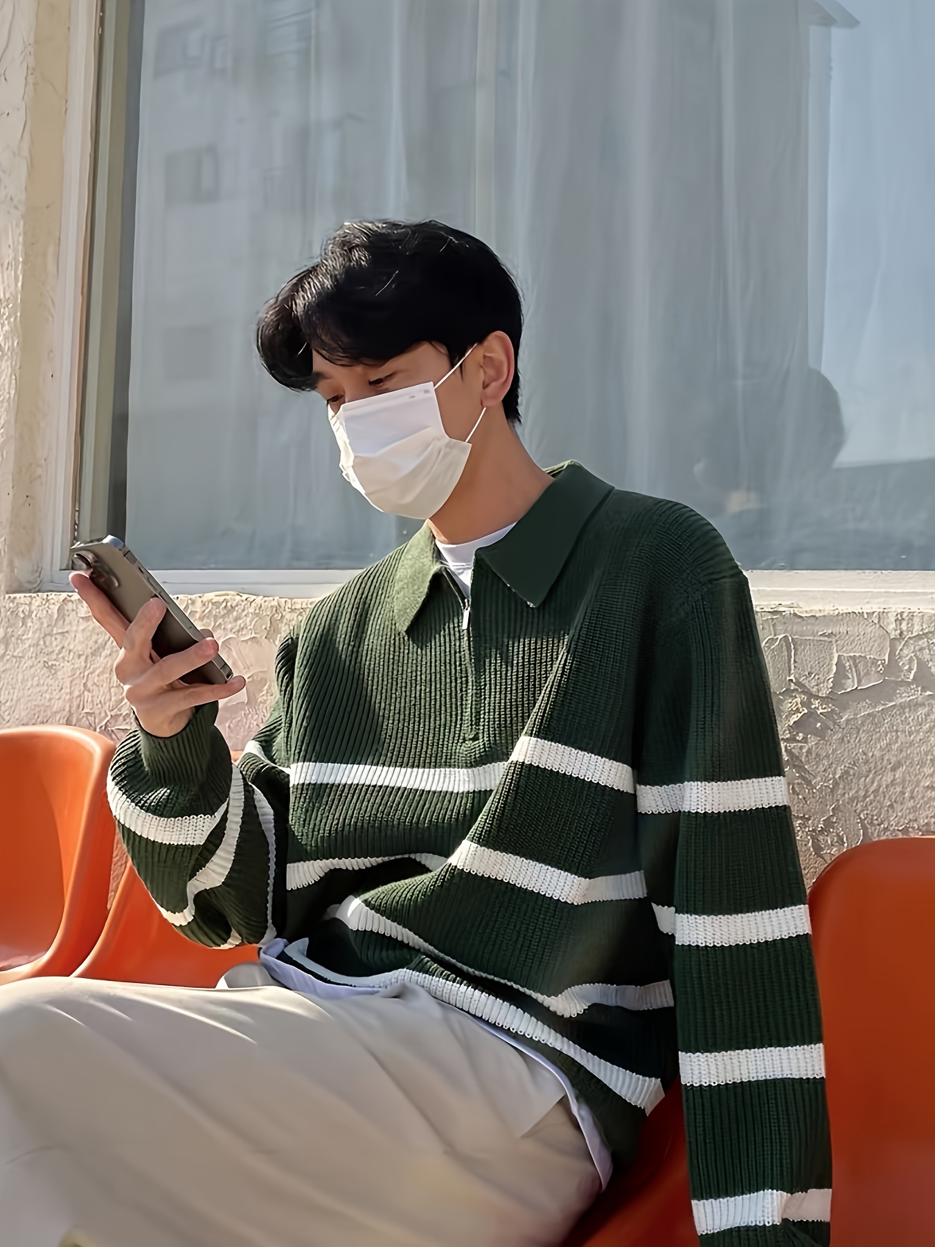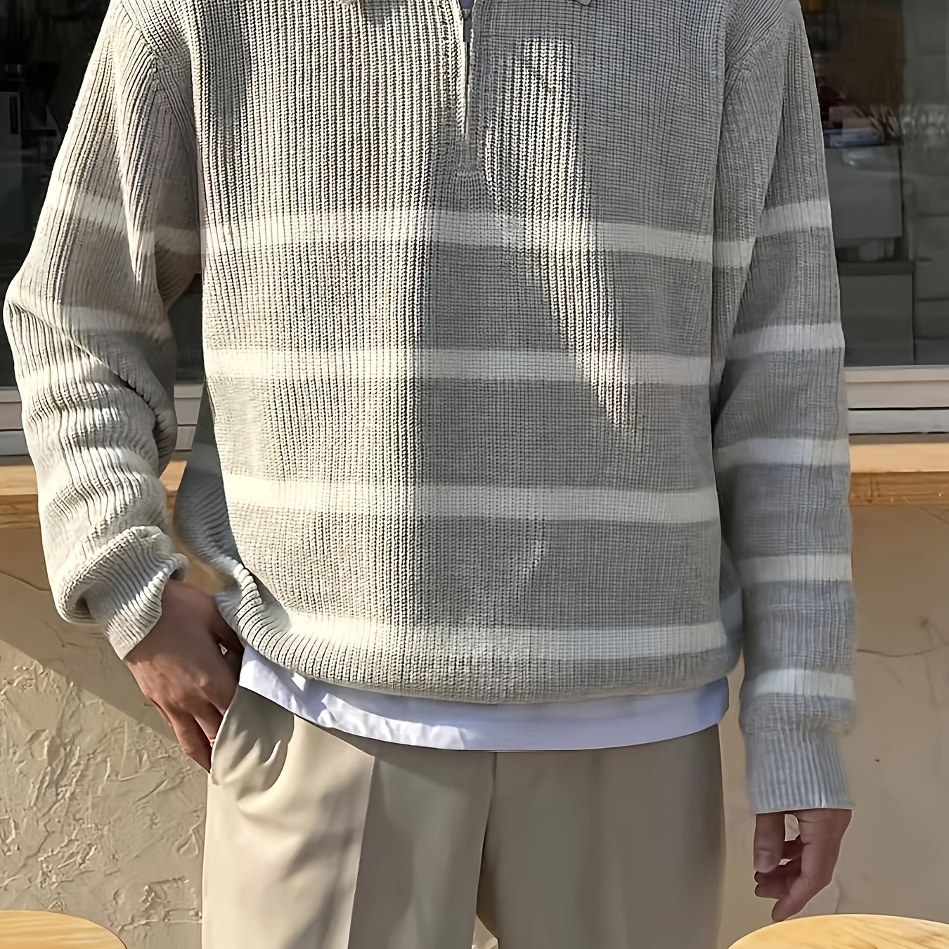 Men’s Stylish Stripe Pattern Knitted Pullover – Casual Breathable Long Sleeve Half Zipper Top