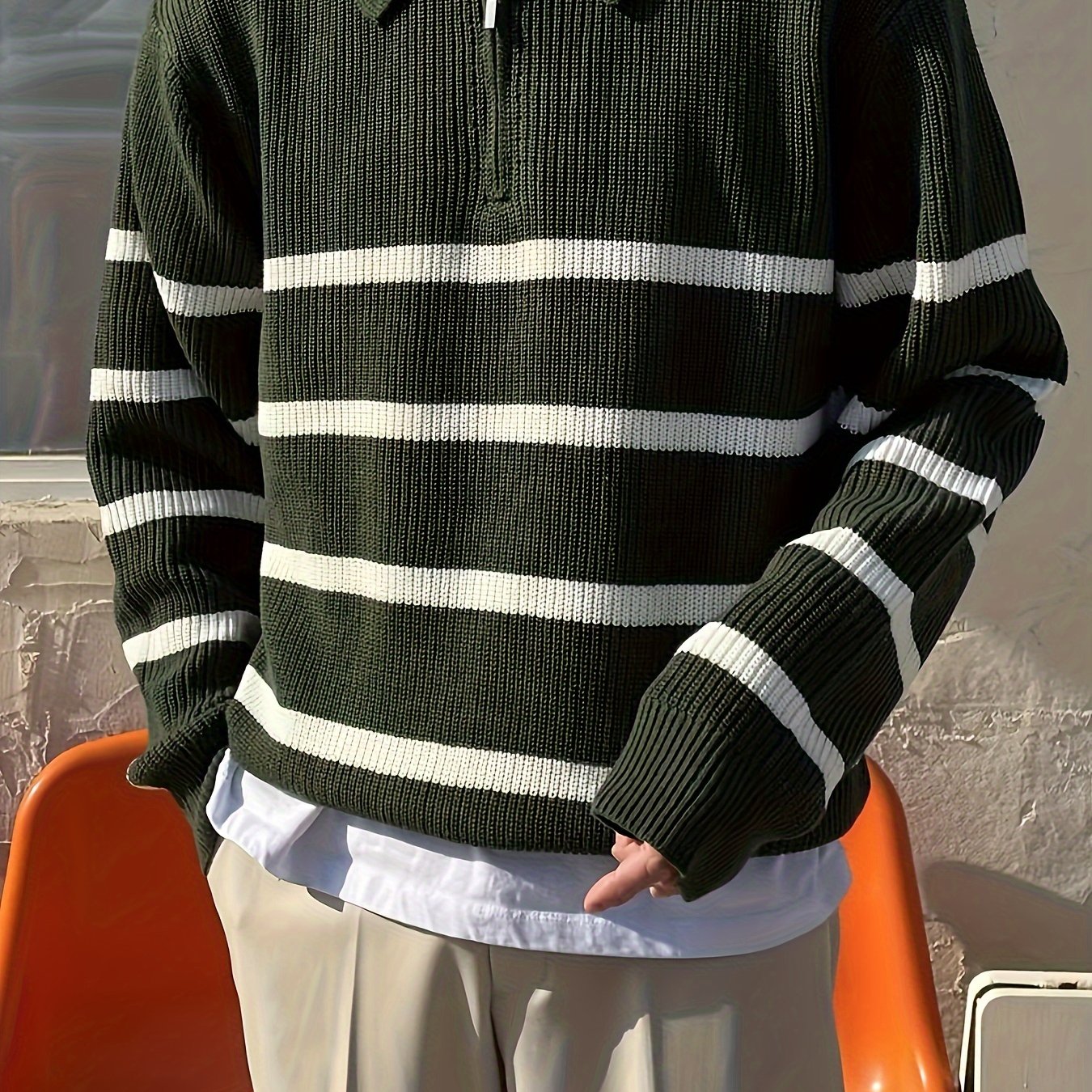 mens stylish stripe pattern knitted pullover casual breathable long sleeve lapel half zipper top for city walk street hanging outdoor activities details 0